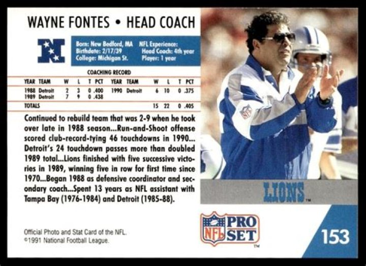Of addition to being a former collegiate and professional football player, Wayne Fontes was the head coach of the Detroit Lions in the National Football League from 1988 to 1996. He was born on February 2, 1940, in Detroit, Michigan. His 67 victories and 71 defeats are both the most by a head coach in the history of the club.